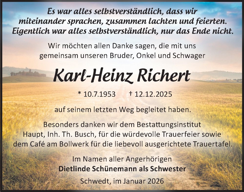 Hier finden Sie alle Traueranzeigen aus der Zeitung, die bisher für Karl-Heinz Richert erschienen sind. Weitere Traueranzeigen, die in der Zeitung erscheinen, werden hier ebenfalls aufgelistet