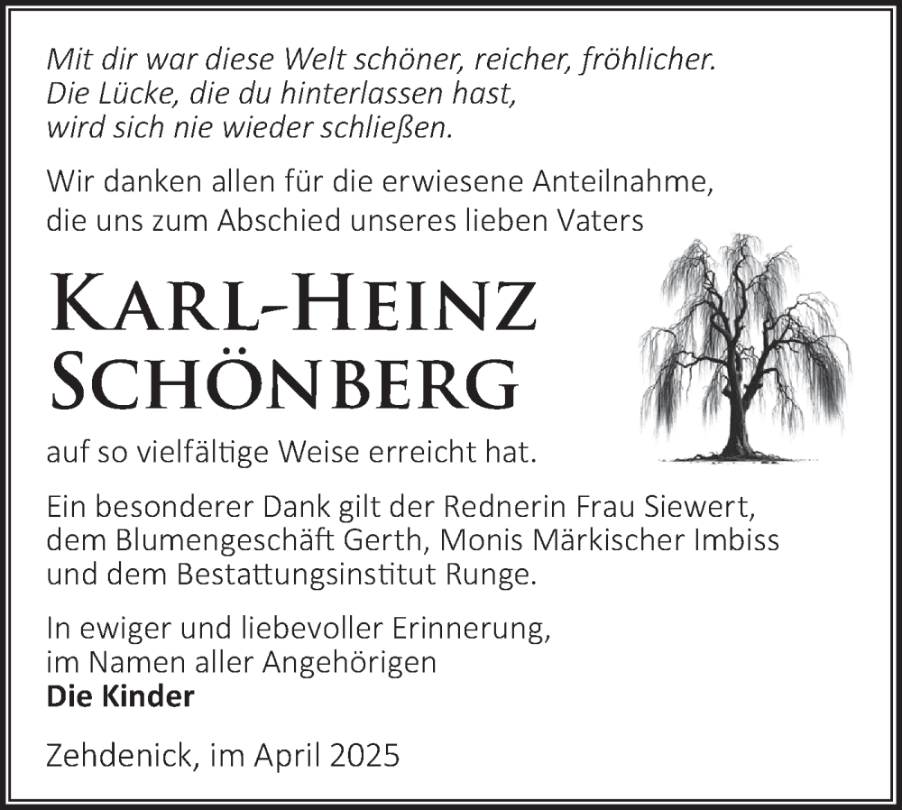 Hier finden Sie alle Traueranzeigen aus der Zeitung, die bisher für Karl-Heinz Schönberg erschienen sind. Weitere Traueranzeigen, die in der Zeitung erscheinen, werden hier ebenfalls aufgelistet
