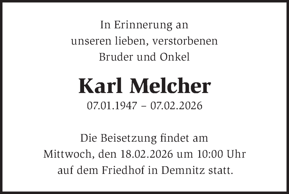 Hier finden Sie alle Traueranzeigen aus der Zeitung, die bisher für Karl Melcher erschienen sind. Weitere Traueranzeigen, die in der Zeitung erscheinen, werden hier ebenfalls aufgelistet