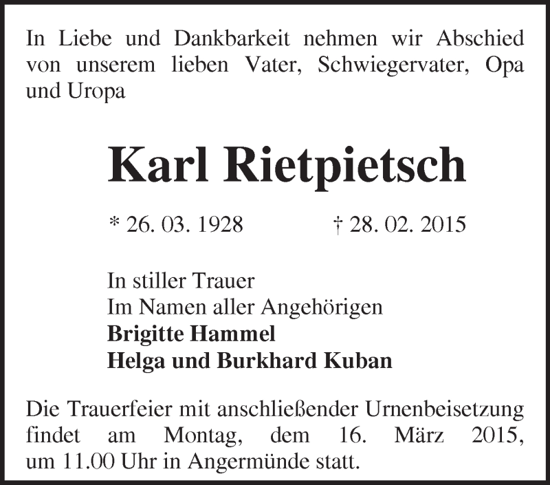 Hier finden Sie alle Traueranzeigen aus der Zeitung, die bisher für Karl Rietpietsch erschienen sind. Weitere Traueranzeigen, die in der Zeitung erscheinen, werden hier ebenfalls aufgelistet