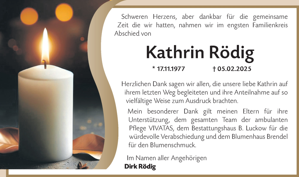 Hier finden Sie alle Traueranzeigen aus der Zeitung, die bisher für Kathrin Rödig erschienen sind. Weitere Traueranzeigen, die in der Zeitung erscheinen, werden hier ebenfalls aufgelistet