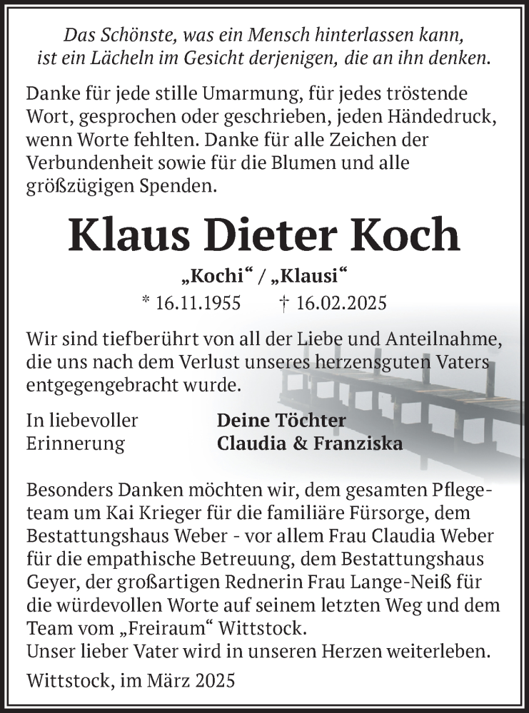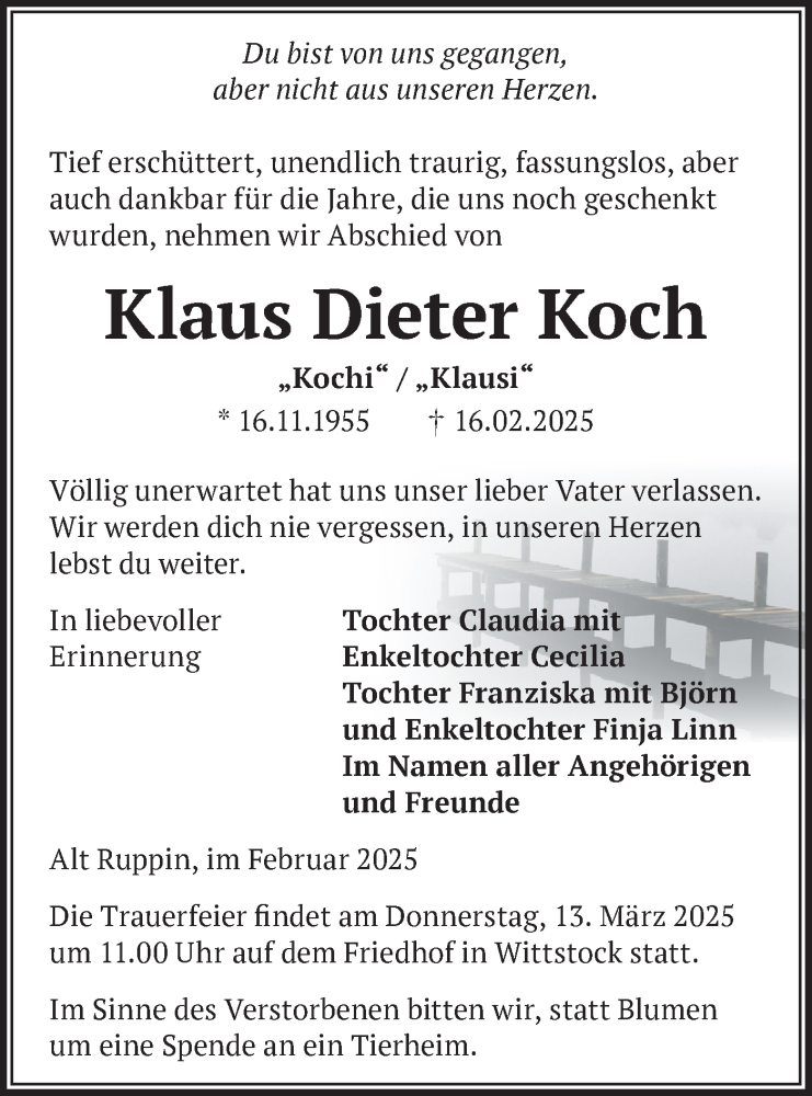 Hier finden Sie alle Traueranzeigen aus der Zeitung, die bisher für Klaus Dieter Koch erschienen sind. Weitere Traueranzeigen, die in der Zeitung erscheinen, werden hier ebenfalls aufgelistet