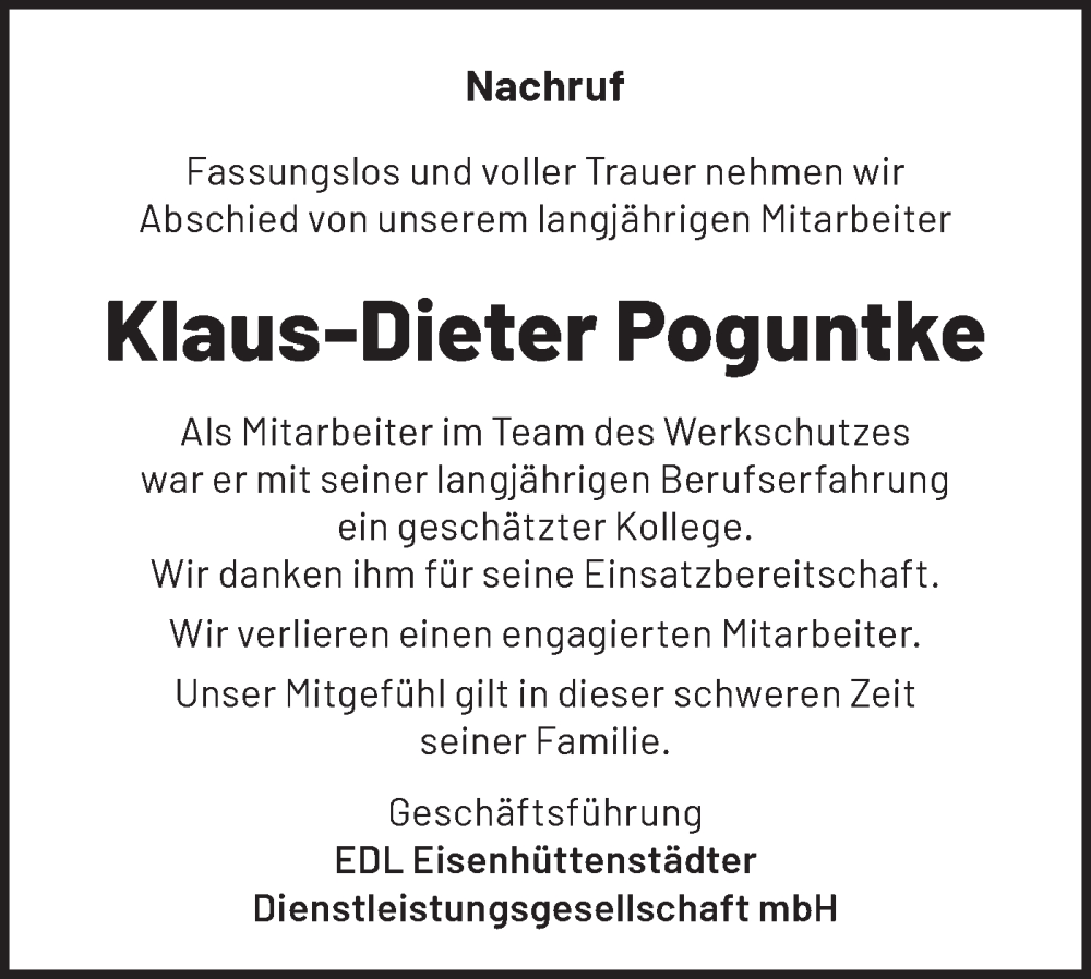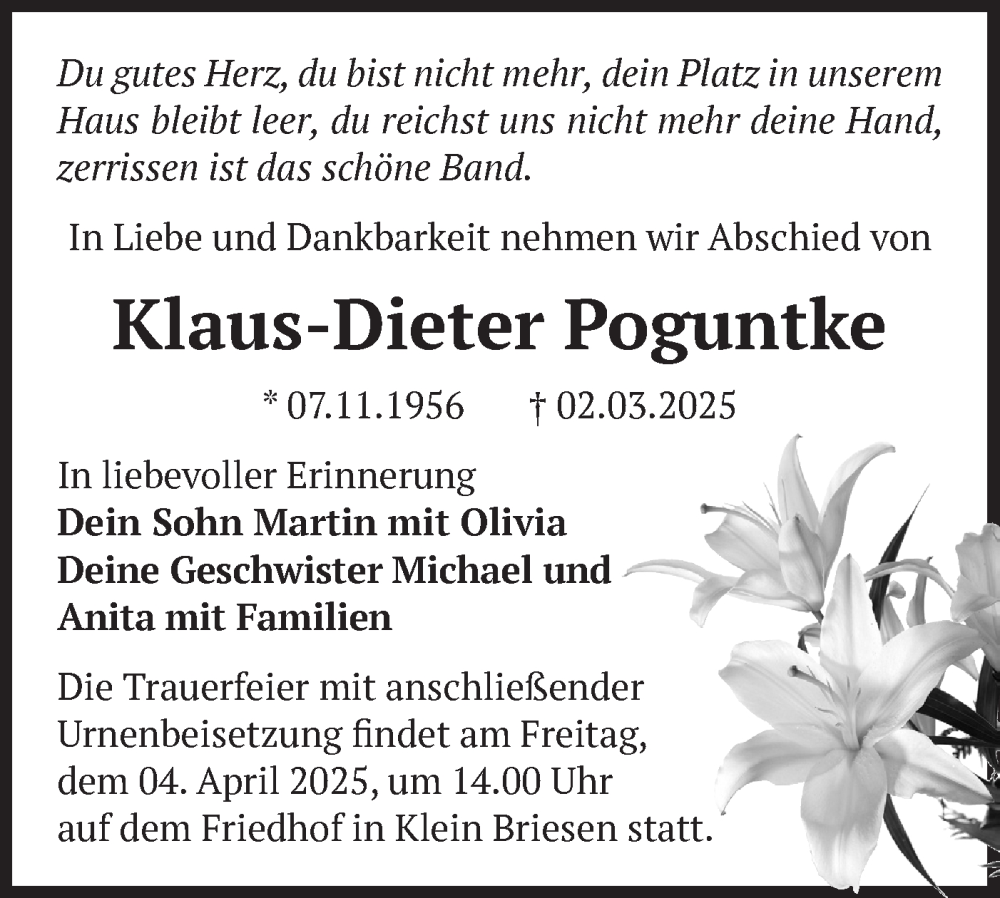 Hier finden Sie alle Traueranzeigen aus der Zeitung, die bisher für Klaus-Dieter Poguntke erschienen sind. Weitere Traueranzeigen, die in der Zeitung erscheinen, werden hier ebenfalls aufgelistet