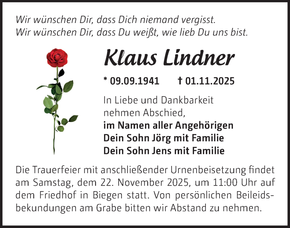 Hier finden Sie alle Traueranzeigen aus der Zeitung, die bisher für Klaus Lindner erschienen sind. Weitere Traueranzeigen, die in der Zeitung erscheinen, werden hier ebenfalls aufgelistet