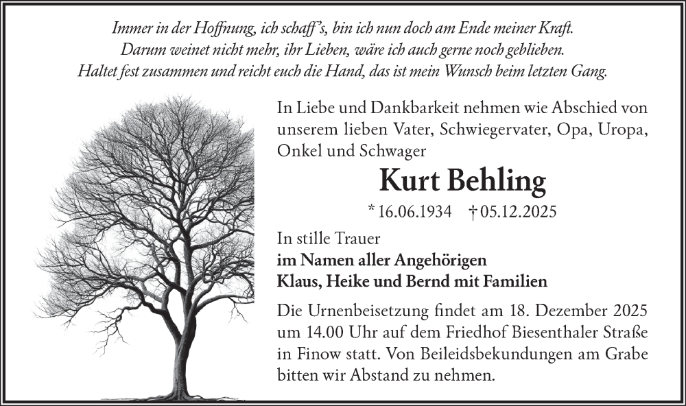 Hier finden Sie alle Traueranzeigen aus der Zeitung, die bisher für Kurt Behling erschienen sind. Weitere Traueranzeigen, die in der Zeitung erscheinen, werden hier ebenfalls aufgelistet