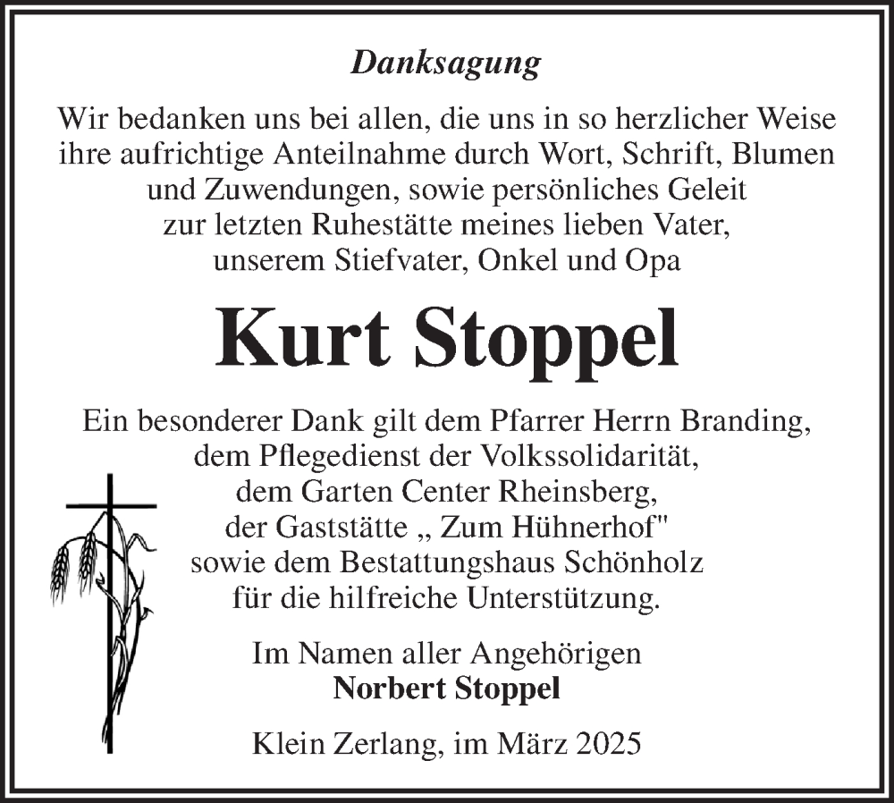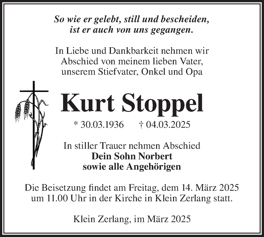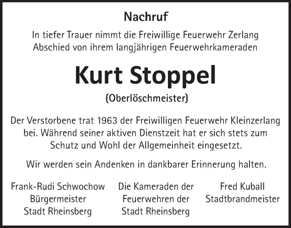 Hier finden Sie alle Traueranzeigen aus der Zeitung, die bisher für Kurt Stoppel erschienen sind. Weitere Traueranzeigen, die in der Zeitung erscheinen, werden hier ebenfalls aufgelistet