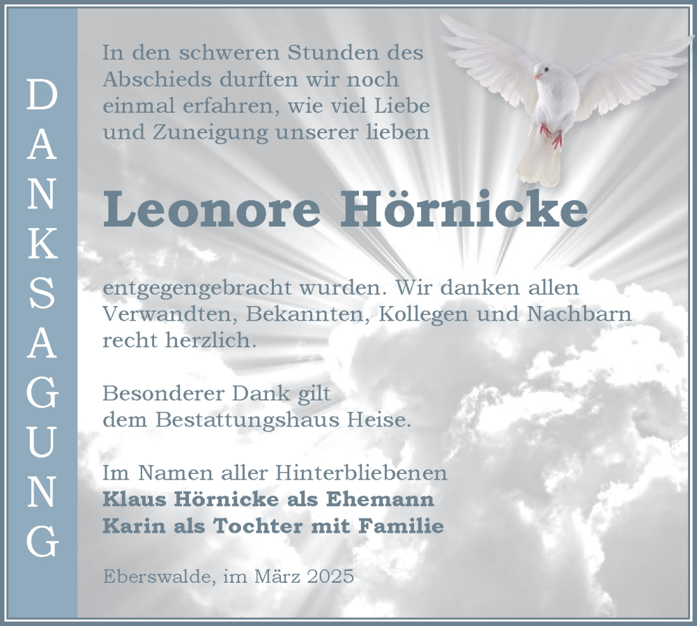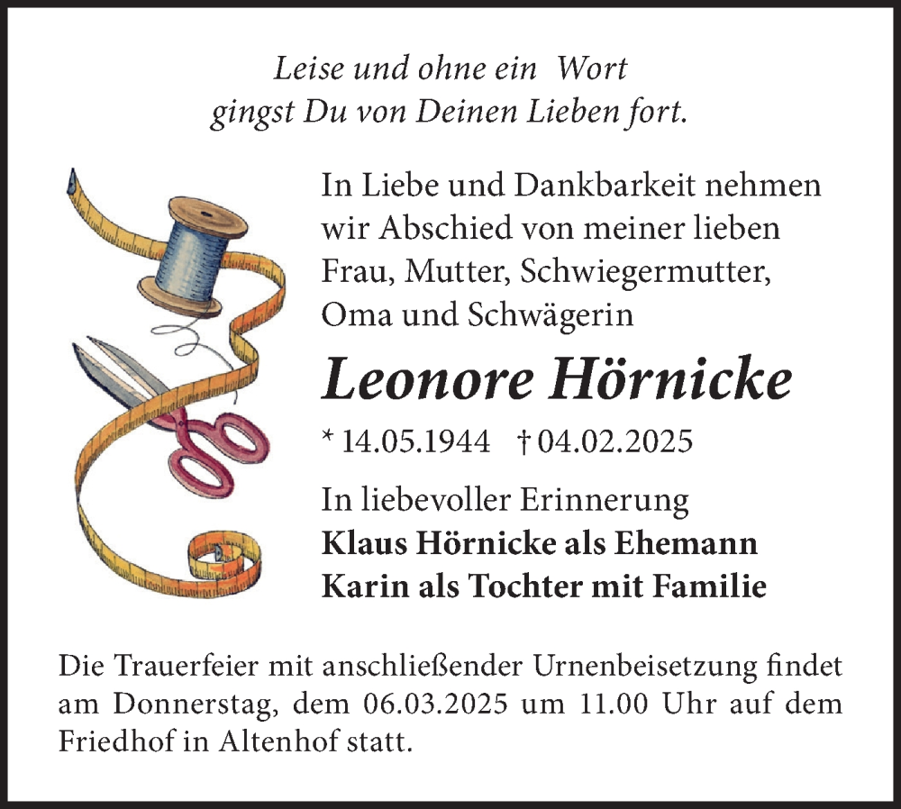 Hier finden Sie alle Traueranzeigen aus der Zeitung, die bisher für Leonore Hörnicke erschienen sind. Weitere Traueranzeigen, die in der Zeitung erscheinen, werden hier ebenfalls aufgelistet