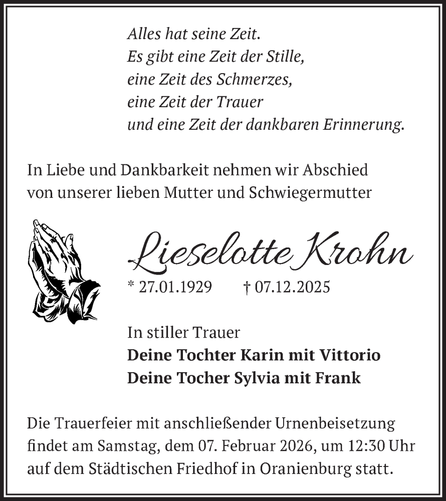 Hier finden Sie alle Traueranzeigen aus der Zeitung, die bisher für Lieselotte Krohn erschienen sind. Weitere Traueranzeigen, die in der Zeitung erscheinen, werden hier ebenfalls aufgelistet