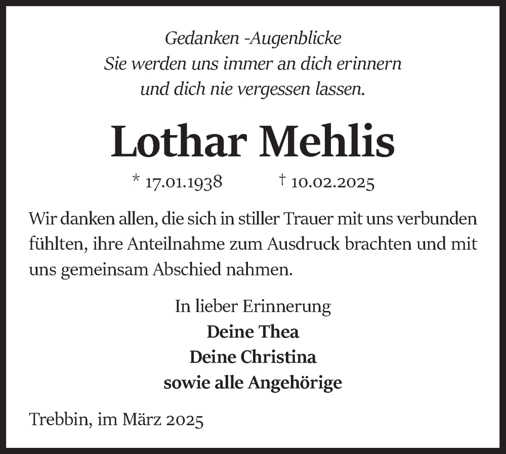 Hier finden Sie alle Traueranzeigen aus der Zeitung, die bisher für Lothar Mehlis erschienen sind. Weitere Traueranzeigen, die in der Zeitung erscheinen, werden hier ebenfalls aufgelistet