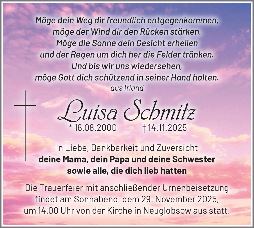 Hier finden Sie alle Traueranzeigen aus der Zeitung, die bisher für Luisa Schmitz erschienen sind. Weitere Traueranzeigen, die in der Zeitung erscheinen, werden hier ebenfalls aufgelistet