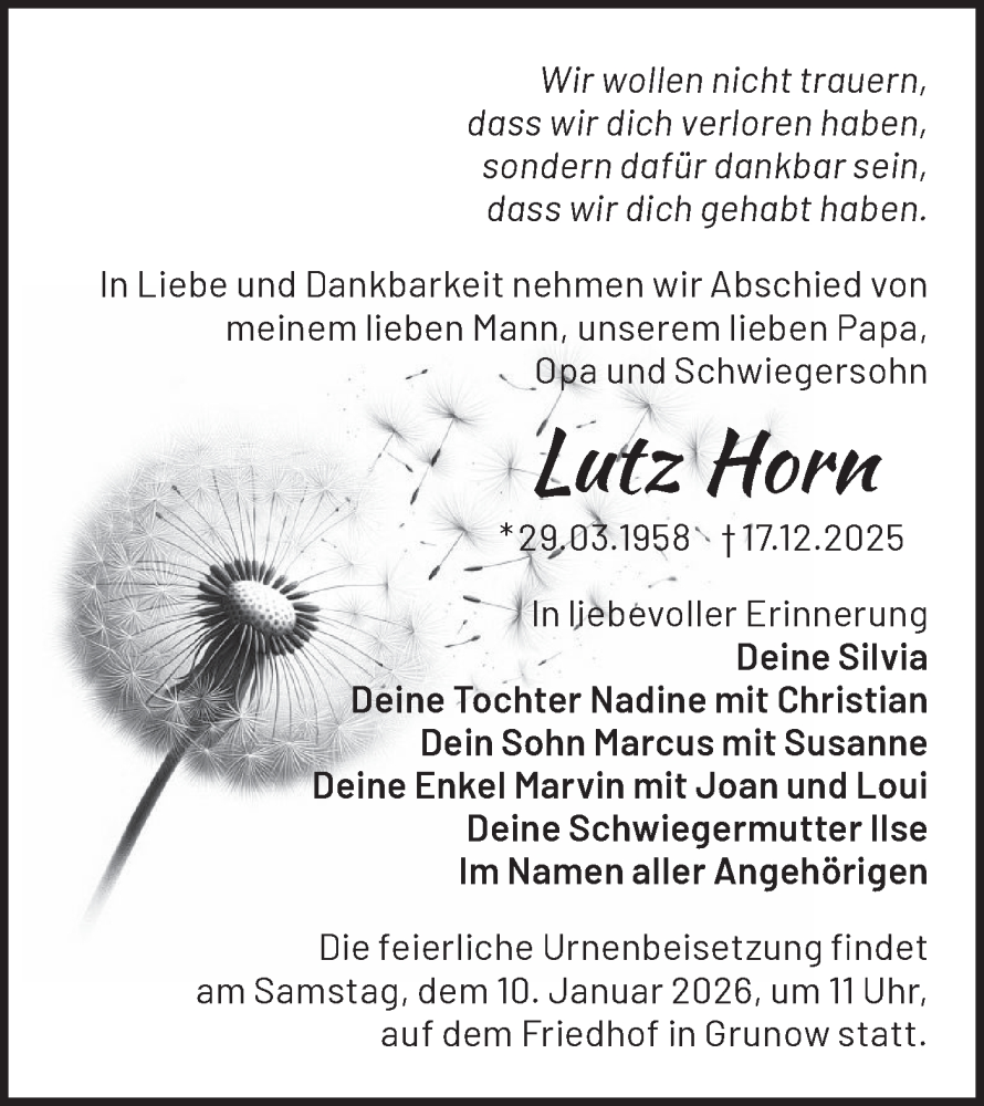 Hier finden Sie alle Traueranzeigen aus der Zeitung, die bisher für Lutz Horn erschienen sind. Weitere Traueranzeigen, die in der Zeitung erscheinen, werden hier ebenfalls aufgelistet