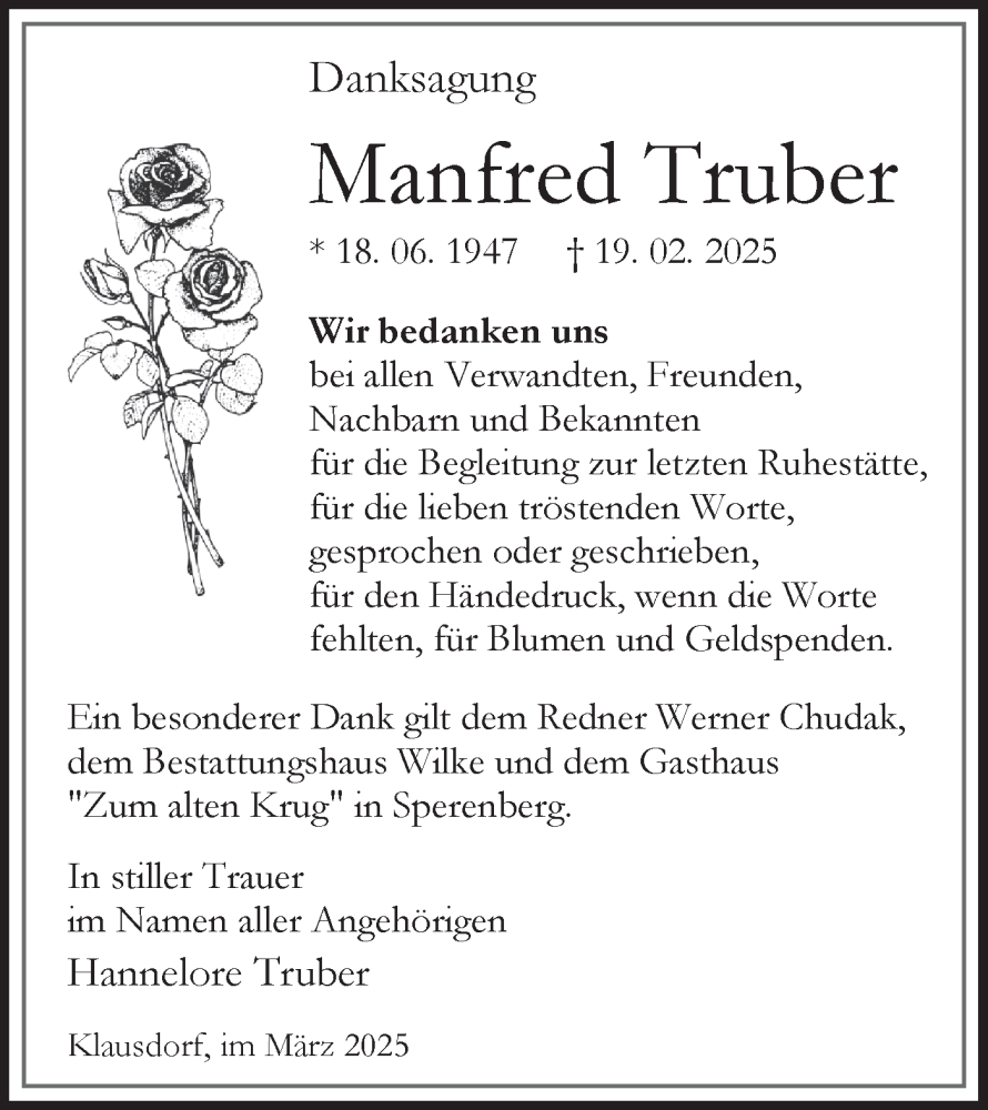 Hier finden Sie alle Traueranzeigen aus der Zeitung, die bisher für Manfred Truber erschienen sind. Weitere Traueranzeigen, die in der Zeitung erscheinen, werden hier ebenfalls aufgelistet