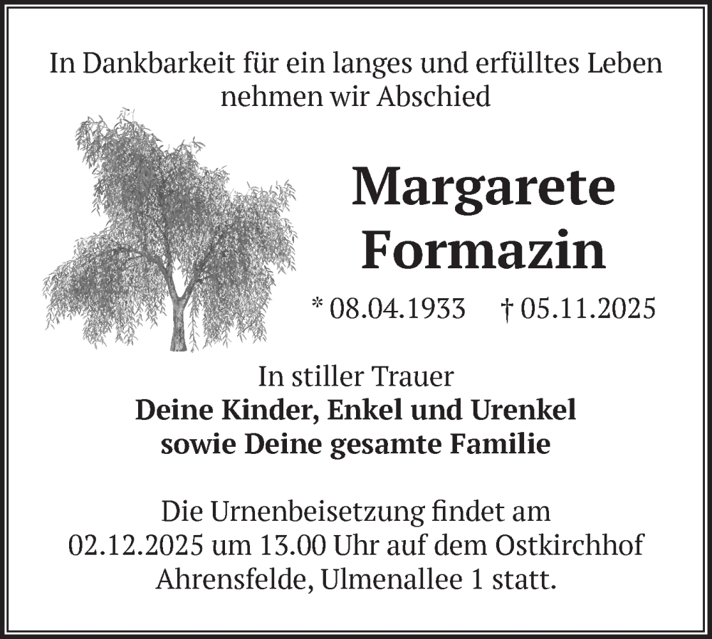 Hier finden Sie alle Traueranzeigen aus der Zeitung, die bisher für Margarete Formazin erschienen sind. Weitere Traueranzeigen, die in der Zeitung erscheinen, werden hier ebenfalls aufgelistet
