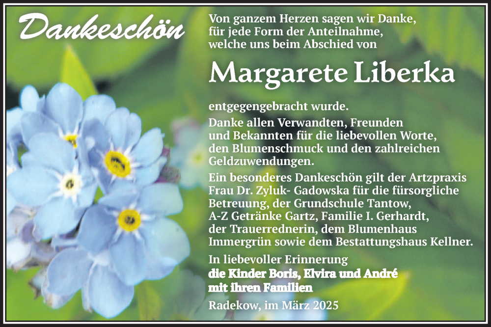 Hier finden Sie alle Traueranzeigen aus der Zeitung, die bisher für Margarete Liberka erschienen sind. Weitere Traueranzeigen, die in der Zeitung erscheinen, werden hier ebenfalls aufgelistet