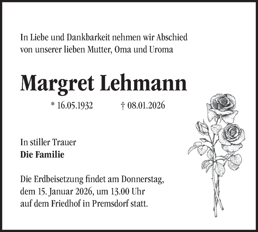 Hier finden Sie alle Traueranzeigen aus der Zeitung, die bisher für Margret Lehmann erschienen sind. Weitere Traueranzeigen, die in der Zeitung erscheinen, werden hier ebenfalls aufgelistet