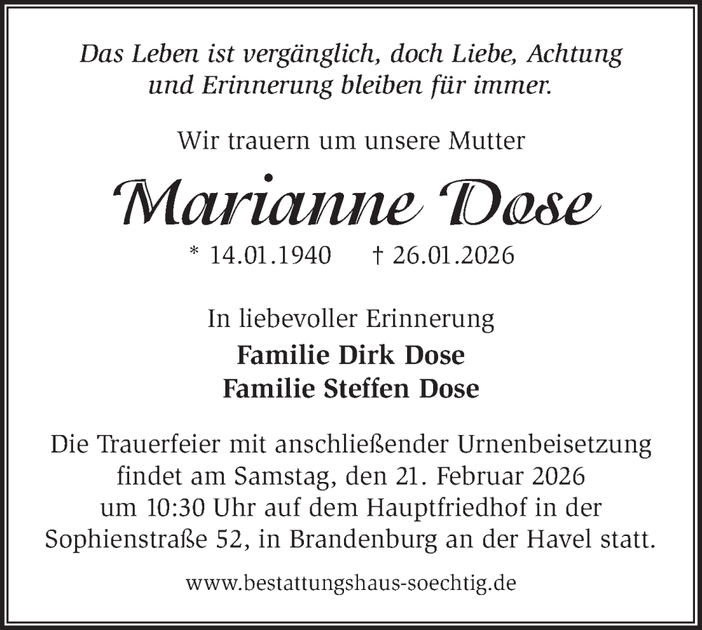 Hier finden Sie alle Traueranzeigen aus der Zeitung, die bisher für Marianne Dose erschienen sind. Weitere Traueranzeigen, die in der Zeitung erscheinen, werden hier ebenfalls aufgelistet