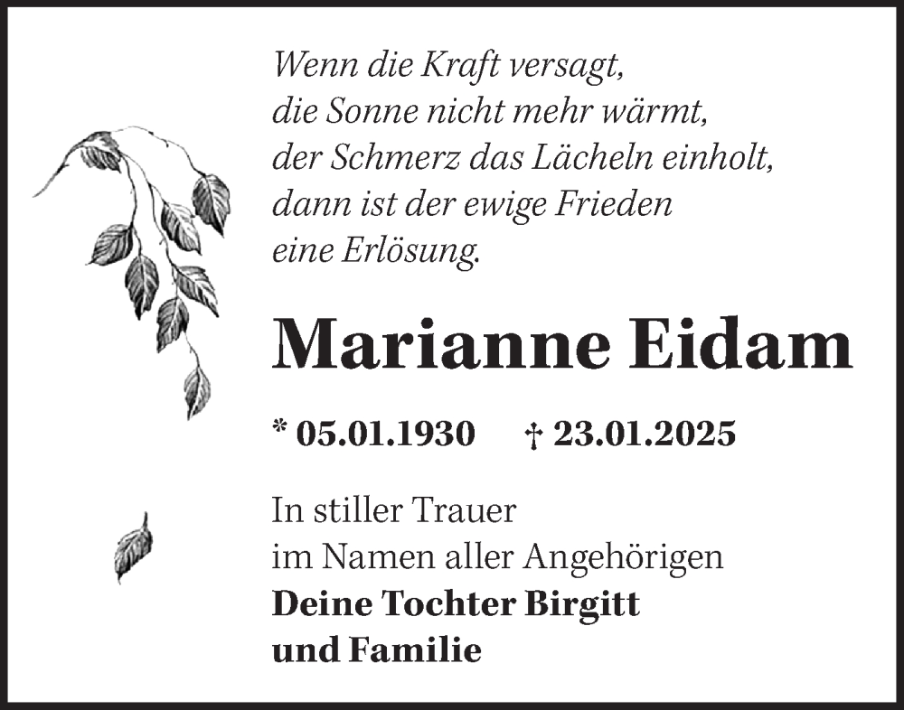 Hier finden Sie alle Traueranzeigen aus der Zeitung, die bisher für Marianne Eidam erschienen sind. Weitere Traueranzeigen, die in der Zeitung erscheinen, werden hier ebenfalls aufgelistet