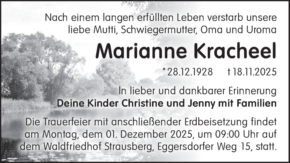 Hier finden Sie alle Traueranzeigen aus der Zeitung, die bisher für Marianne Kracheel erschienen sind. Weitere Traueranzeigen, die in der Zeitung erscheinen, werden hier ebenfalls aufgelistet