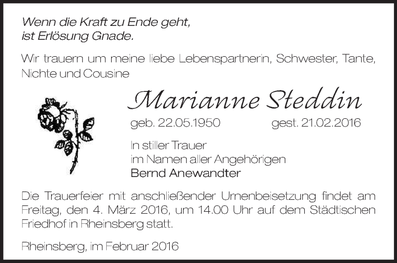 Hier finden Sie alle Traueranzeigen aus der Zeitung, die bisher für Marianne Steddin erschienen sind. Weitere Traueranzeigen, die in der Zeitung erscheinen, werden hier ebenfalls aufgelistet