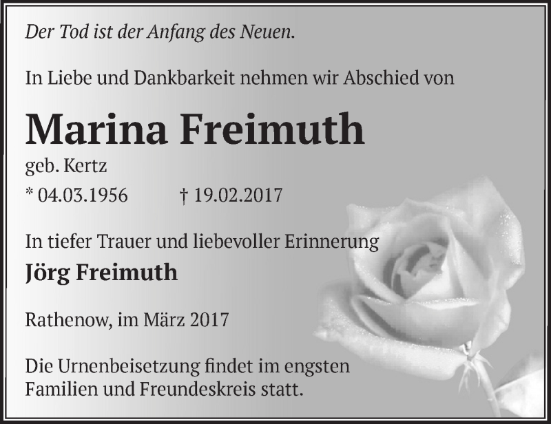 Hier finden Sie alle Traueranzeigen aus der Zeitung, die bisher für Marina Freimuth erschienen sind. Weitere Traueranzeigen, die in der Zeitung erscheinen, werden hier ebenfalls aufgelistet