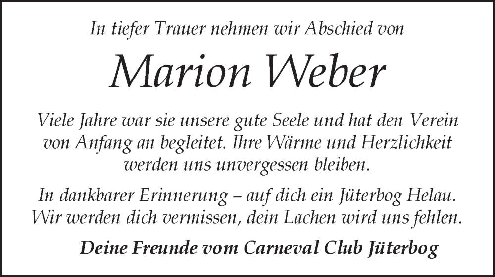 Hier finden Sie alle Traueranzeigen aus der Zeitung, die bisher für Marion Weber erschienen sind. Weitere Traueranzeigen, die in der Zeitung erscheinen, werden hier ebenfalls aufgelistet