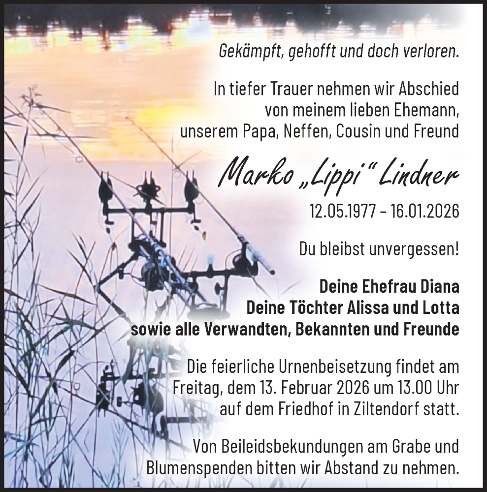 Hier finden Sie alle Traueranzeigen aus der Zeitung, die bisher für Marko Lindner erschienen sind. Weitere Traueranzeigen, die in der Zeitung erscheinen, werden hier ebenfalls aufgelistet