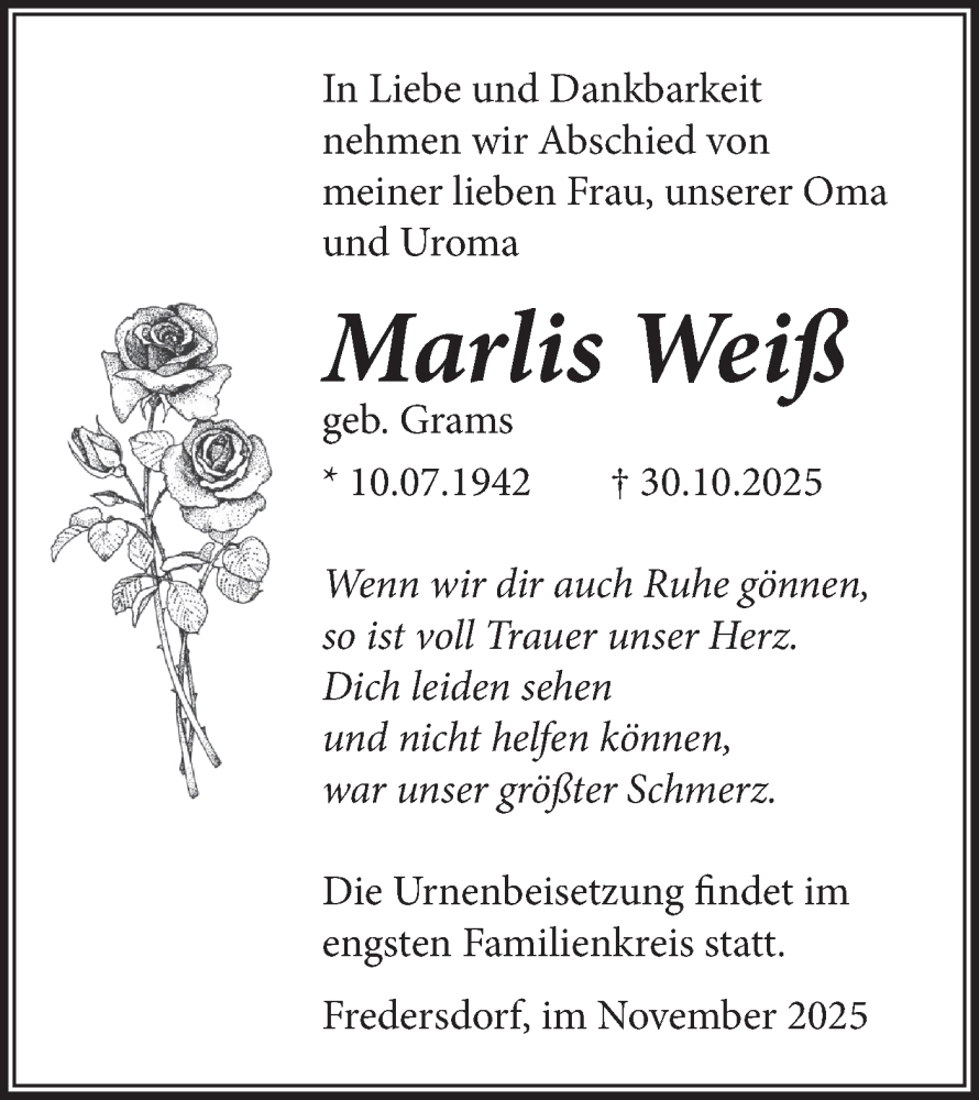 Hier finden Sie alle Traueranzeigen aus der Zeitung, die bisher für Marlis Weiß erschienen sind. Weitere Traueranzeigen, die in der Zeitung erscheinen, werden hier ebenfalls aufgelistet
