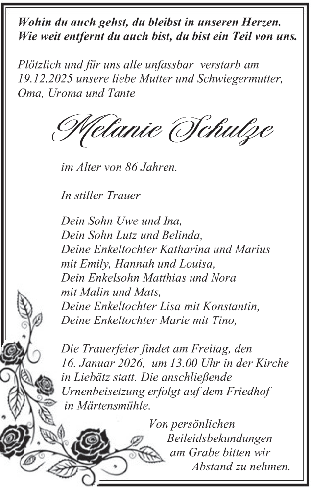 Hier finden Sie alle Traueranzeigen aus der Zeitung, die bisher für Melanie Schulze erschienen sind. Weitere Traueranzeigen, die in der Zeitung erscheinen, werden hier ebenfalls aufgelistet