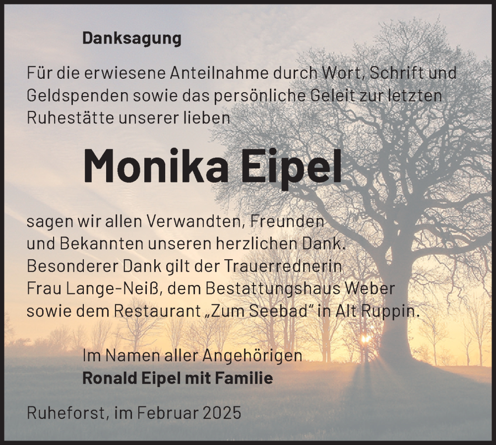 Hier finden Sie alle Traueranzeigen aus der Zeitung, die bisher für Monika Eipel erschienen sind. Weitere Traueranzeigen, die in der Zeitung erscheinen, werden hier ebenfalls aufgelistet