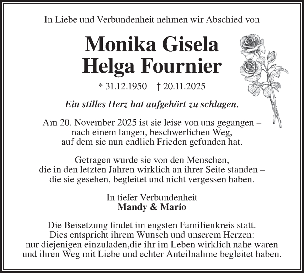 Hier finden Sie alle Traueranzeigen aus der Zeitung, die bisher für Monika Gisela Helga Fournier erschienen sind. Weitere Traueranzeigen, die in der Zeitung erscheinen, werden hier ebenfalls aufgelistet