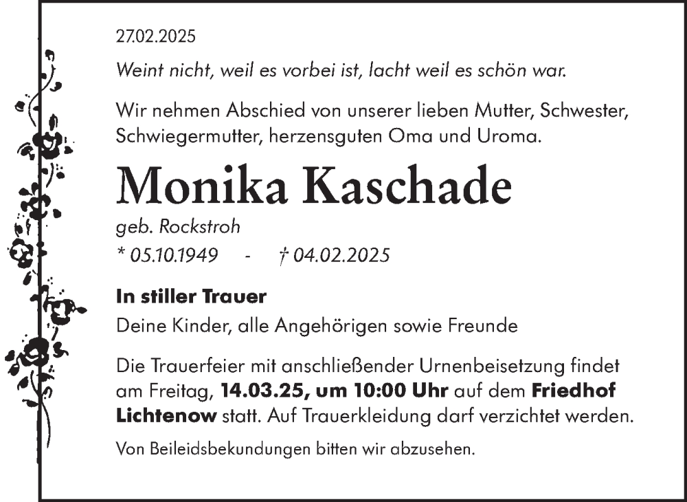 Hier finden Sie alle Traueranzeigen aus der Zeitung, die bisher für Monika Kaschade erschienen sind. Weitere Traueranzeigen, die in der Zeitung erscheinen, werden hier ebenfalls aufgelistet