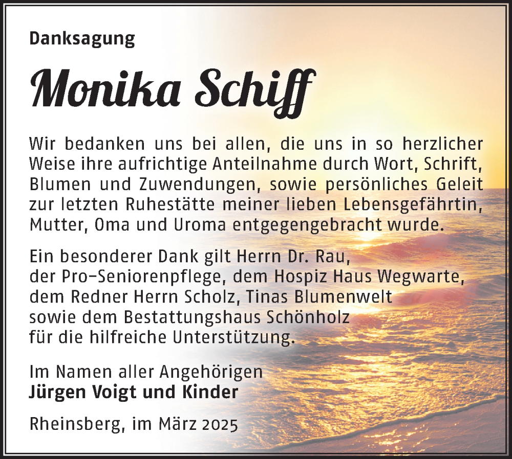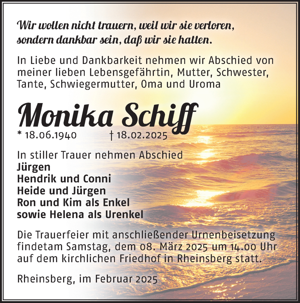 Hier finden Sie alle Traueranzeigen aus der Zeitung, die bisher für Monika Schiff erschienen sind. Weitere Traueranzeigen, die in der Zeitung erscheinen, werden hier ebenfalls aufgelistet