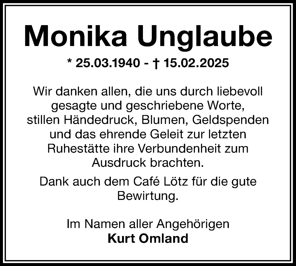 Hier finden Sie alle Traueranzeigen aus der Zeitung, die bisher für Monika Unglaube erschienen sind. Weitere Traueranzeigen, die in der Zeitung erscheinen, werden hier ebenfalls aufgelistet