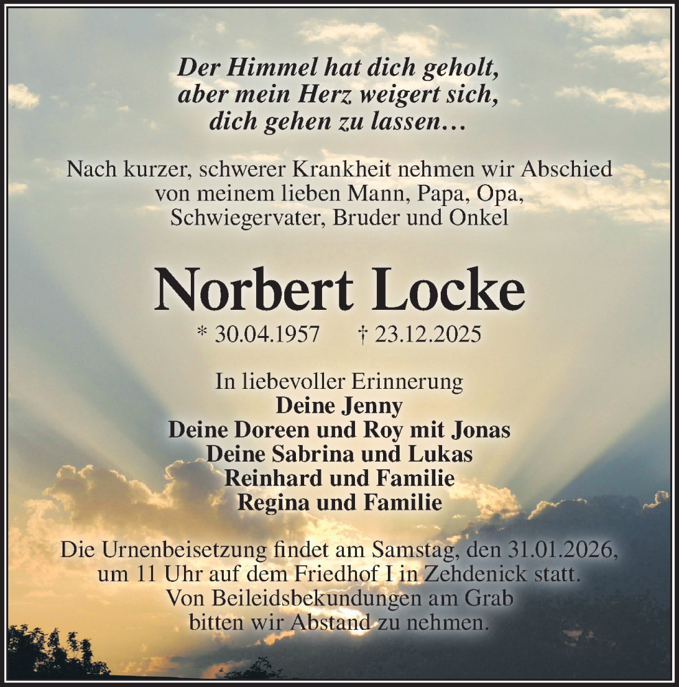 Hier finden Sie alle Traueranzeigen aus der Zeitung, die bisher für Norbert Locke erschienen sind. Weitere Traueranzeigen, die in der Zeitung erscheinen, werden hier ebenfalls aufgelistet