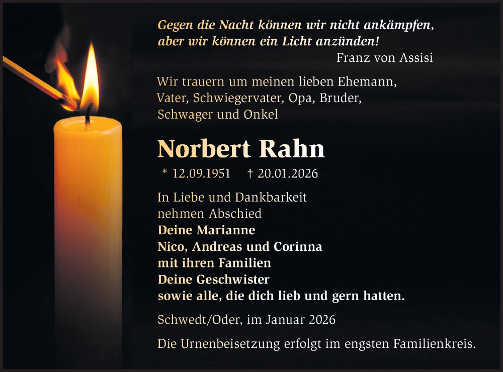 Hier finden Sie alle Traueranzeigen aus der Zeitung, die bisher für Norbert Rahn erschienen sind. Weitere Traueranzeigen, die in der Zeitung erscheinen, werden hier ebenfalls aufgelistet