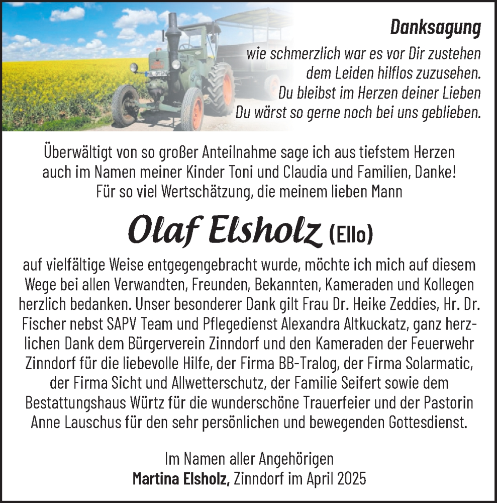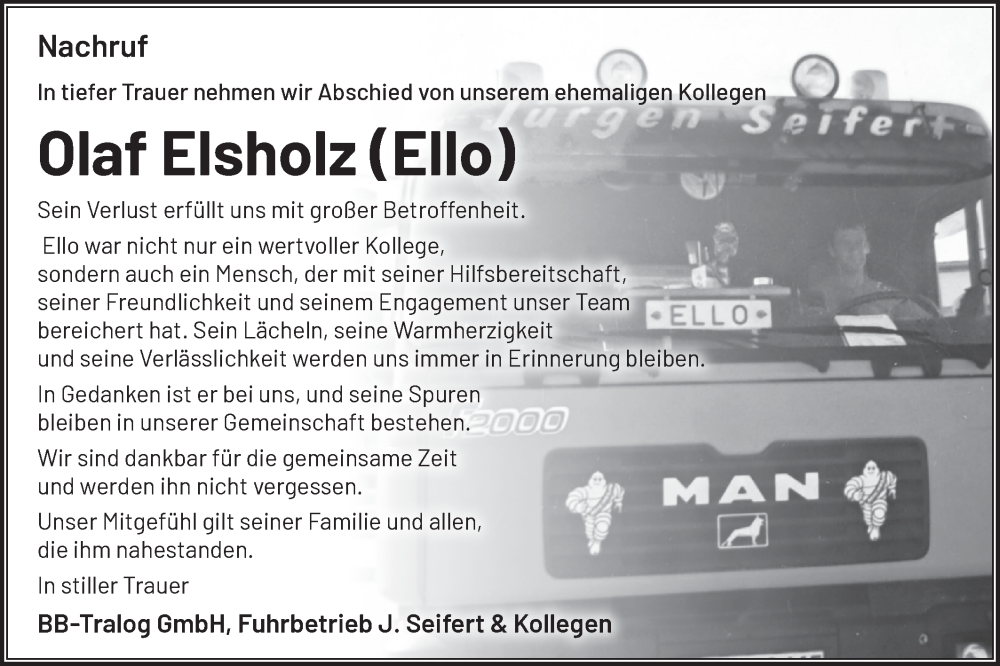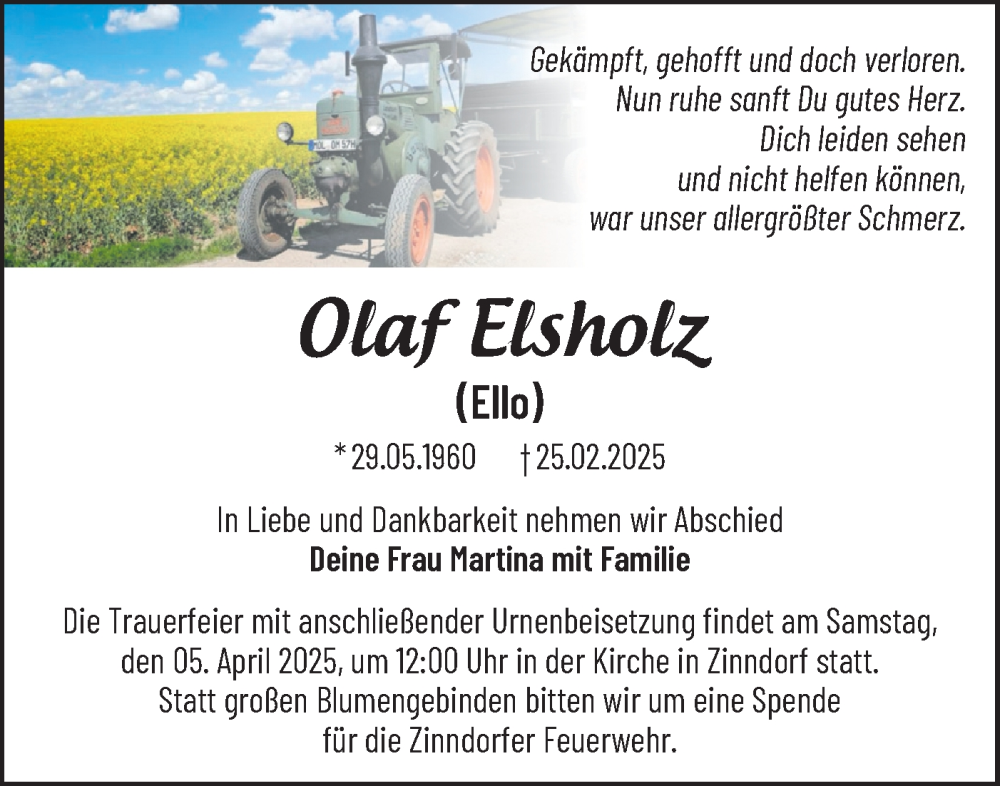 Hier finden Sie alle Traueranzeigen aus der Zeitung, die bisher für Olaf Elsholz erschienen sind. Weitere Traueranzeigen, die in der Zeitung erscheinen, werden hier ebenfalls aufgelistet