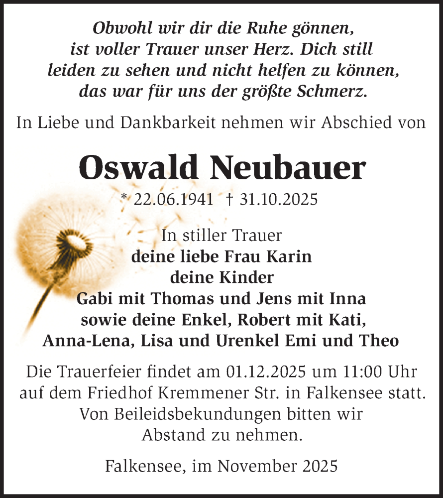 Hier finden Sie alle Traueranzeigen aus der Zeitung, die bisher für Oswald Neubauer erschienen sind. Weitere Traueranzeigen, die in der Zeitung erscheinen, werden hier ebenfalls aufgelistet