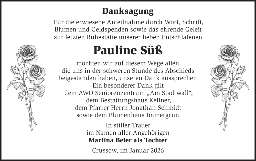 Hier finden Sie alle Traueranzeigen aus der Zeitung, die bisher für Pauline Süß erschienen sind. Weitere Traueranzeigen, die in der Zeitung erscheinen, werden hier ebenfalls aufgelistet