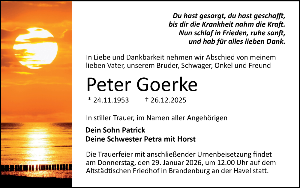 Hier finden Sie alle Traueranzeigen aus der Zeitung, die bisher für Peter Goerke erschienen sind. Weitere Traueranzeigen, die in der Zeitung erscheinen, werden hier ebenfalls aufgelistet