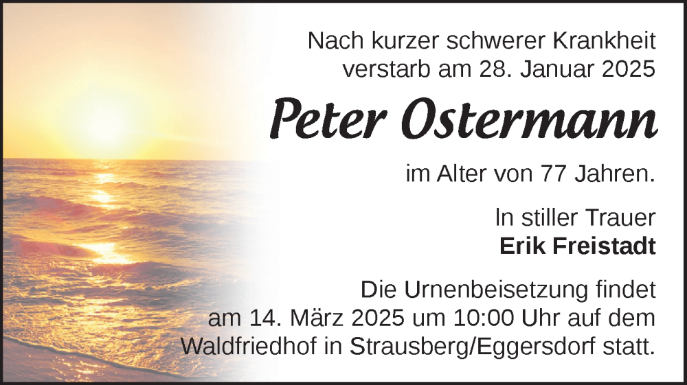 Hier finden Sie alle Traueranzeigen aus der Zeitung, die bisher für Peter Ostermann erschienen sind. Weitere Traueranzeigen, die in der Zeitung erscheinen, werden hier ebenfalls aufgelistet