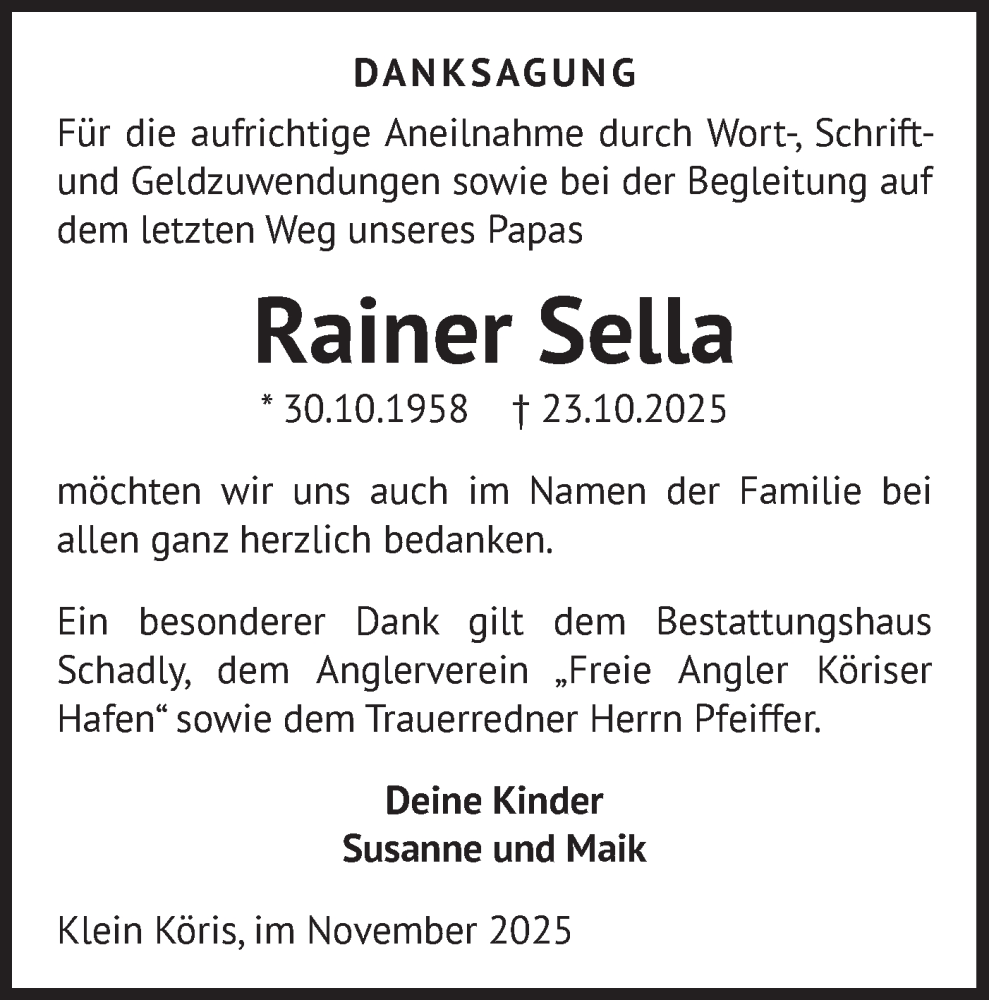 Hier finden Sie alle Traueranzeigen aus der Zeitung, die bisher für Rainer Sella erschienen sind. Weitere Traueranzeigen, die in der Zeitung erscheinen, werden hier ebenfalls aufgelistet