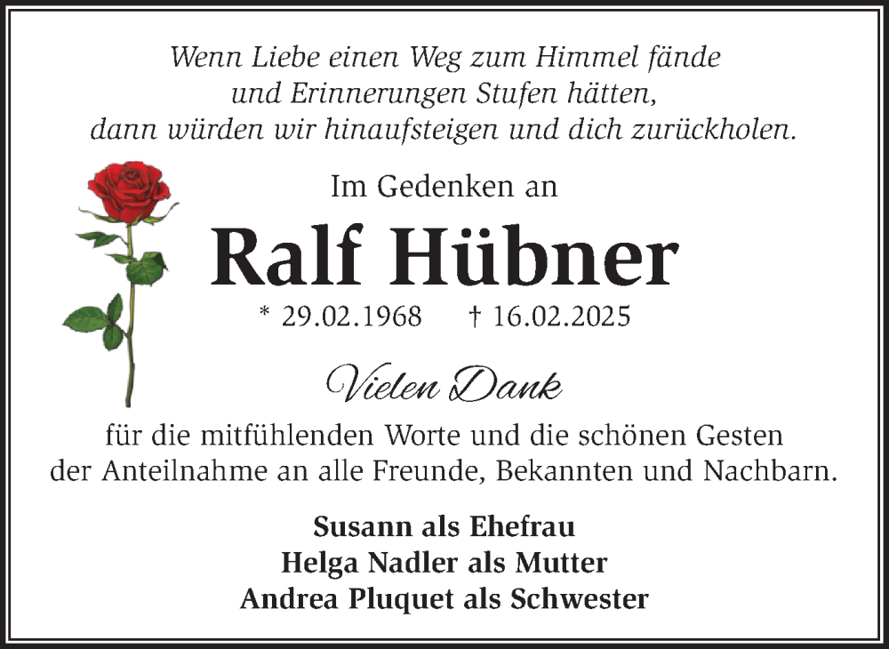 Hier finden Sie alle Traueranzeigen aus der Zeitung, die bisher für Ralf Hübner erschienen sind. Weitere Traueranzeigen, die in der Zeitung erscheinen, werden hier ebenfalls aufgelistet
