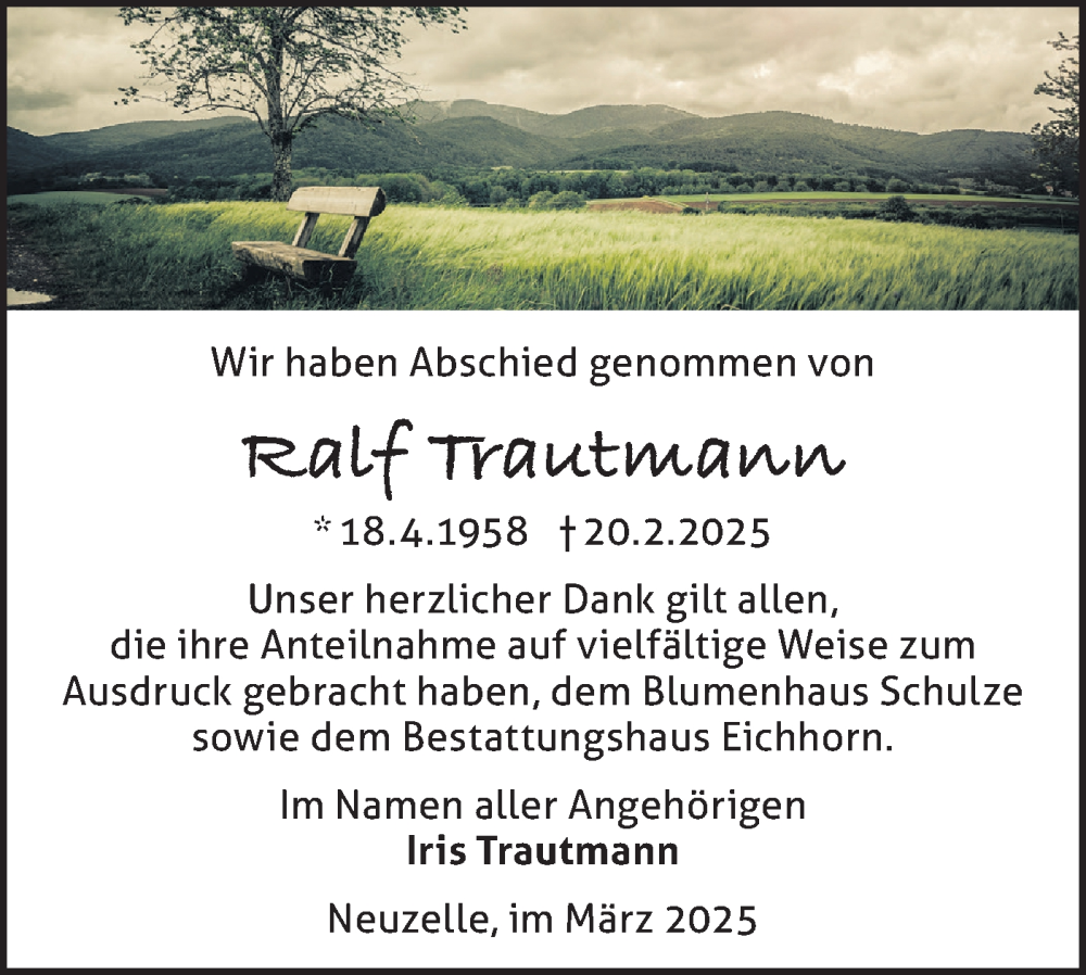Hier finden Sie alle Traueranzeigen aus der Zeitung, die bisher für Ralf Trautmann erschienen sind. Weitere Traueranzeigen, die in der Zeitung erscheinen, werden hier ebenfalls aufgelistet