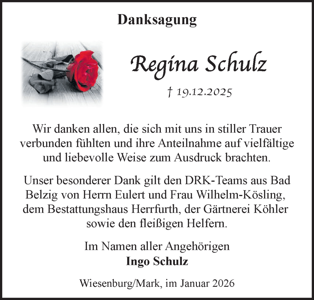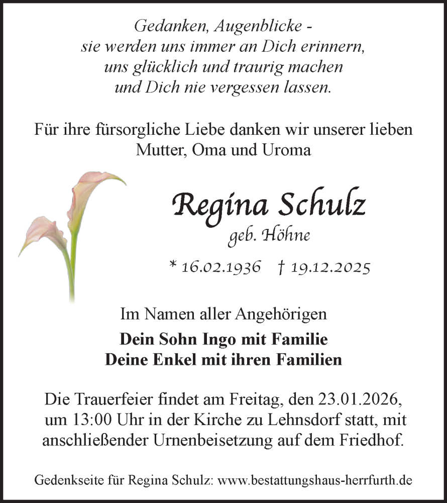 Hier finden Sie alle Traueranzeigen aus der Zeitung, die bisher für Regina Schulz erschienen sind. Weitere Traueranzeigen, die in der Zeitung erscheinen, werden hier ebenfalls aufgelistet