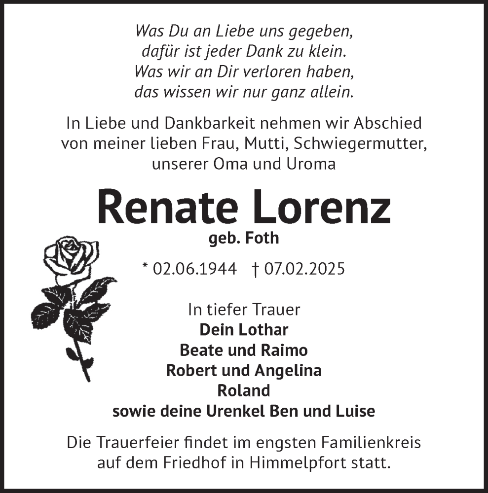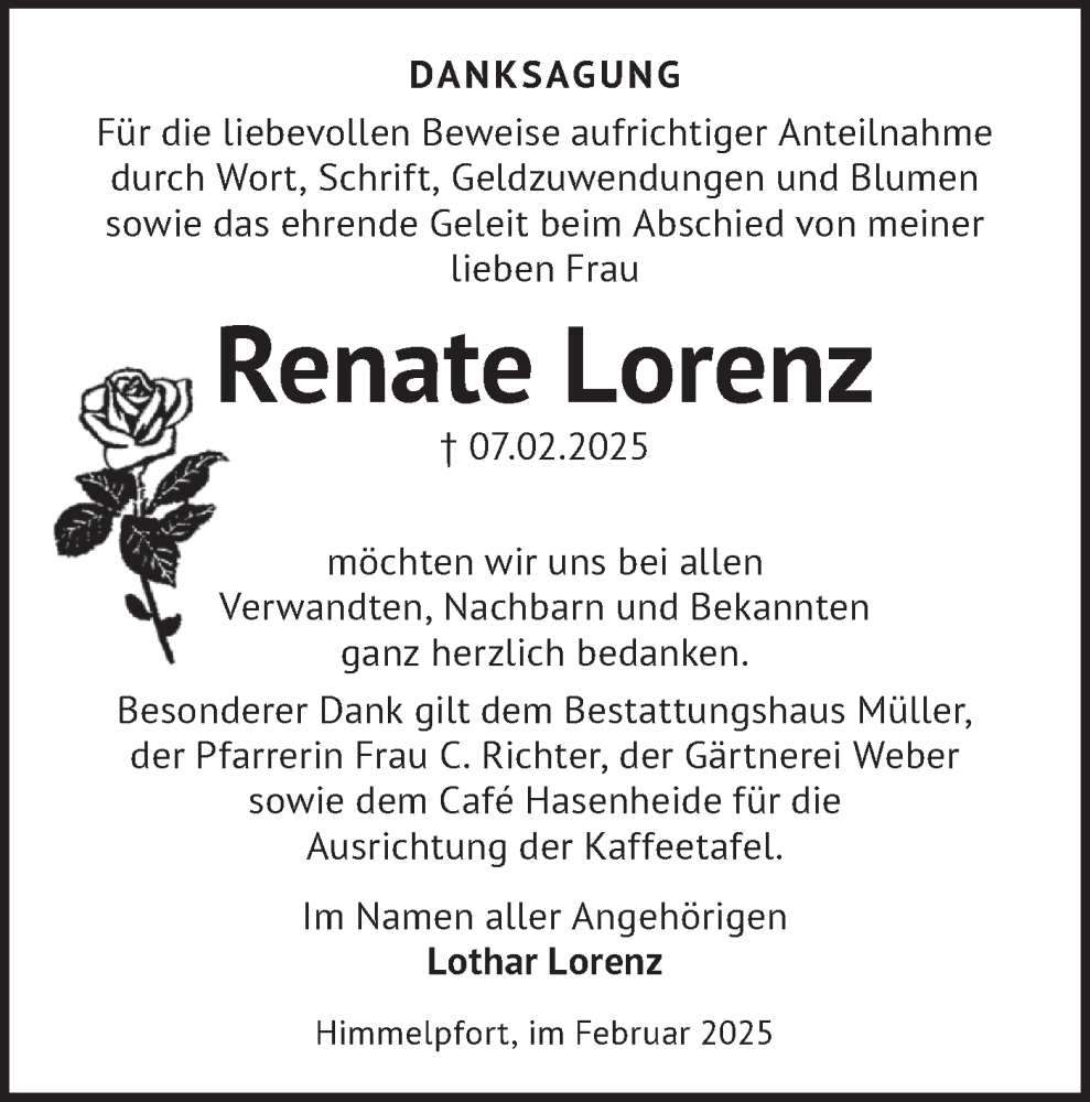 Hier finden Sie alle Traueranzeigen aus der Zeitung, die bisher für Renate Lorenz erschienen sind. Weitere Traueranzeigen, die in der Zeitung erscheinen, werden hier ebenfalls aufgelistet