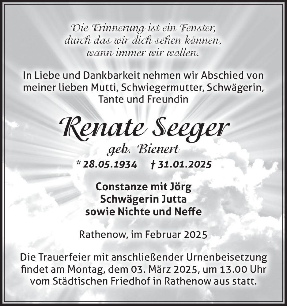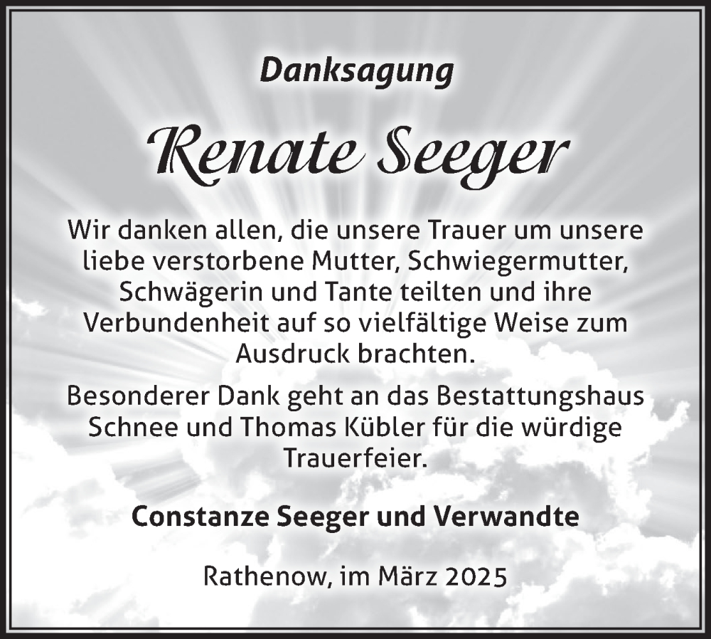Hier finden Sie alle Traueranzeigen aus der Zeitung, die bisher für Renate Seeger erschienen sind. Weitere Traueranzeigen, die in der Zeitung erscheinen, werden hier ebenfalls aufgelistet