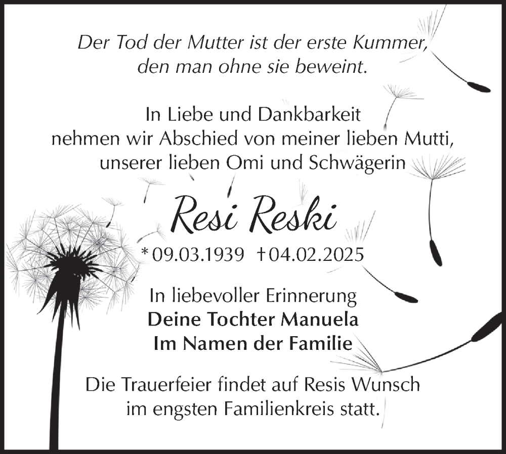 Hier finden Sie alle Traueranzeigen aus der Zeitung, die bisher für Resi Reski erschienen sind. Weitere Traueranzeigen, die in der Zeitung erscheinen, werden hier ebenfalls aufgelistet