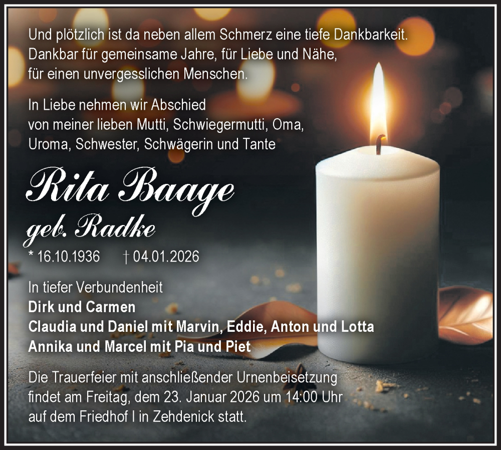 Hier finden Sie alle Traueranzeigen aus der Zeitung, die bisher für Rita Baage erschienen sind. Weitere Traueranzeigen, die in der Zeitung erscheinen, werden hier ebenfalls aufgelistet