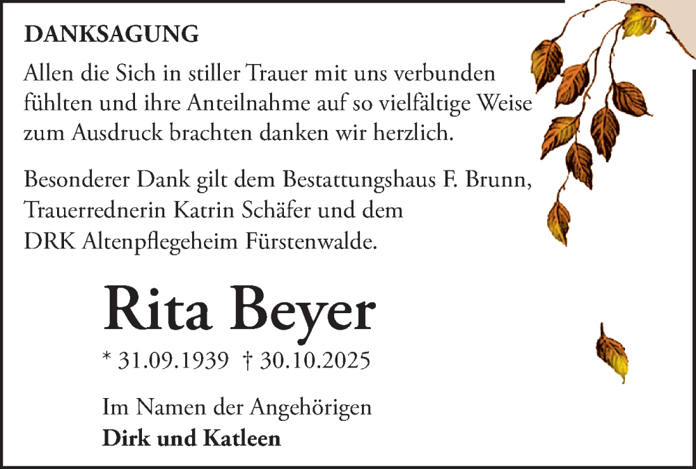 Hier finden Sie alle Traueranzeigen aus der Zeitung, die bisher für Rita Beyer erschienen sind. Weitere Traueranzeigen, die in der Zeitung erscheinen, werden hier ebenfalls aufgelistet