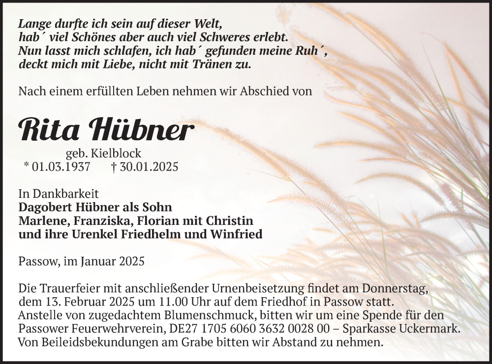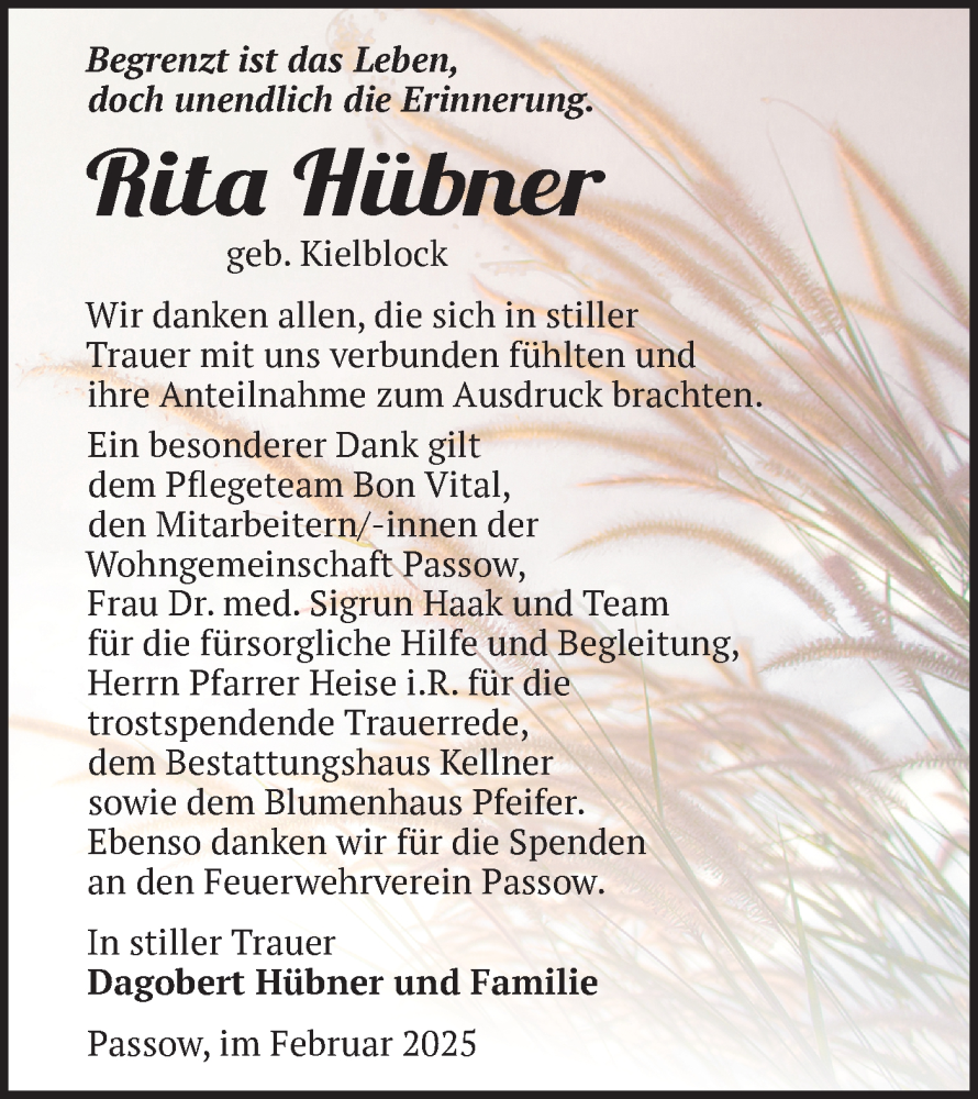 Hier finden Sie alle Traueranzeigen aus der Zeitung, die bisher für Rita Hübner erschienen sind. Weitere Traueranzeigen, die in der Zeitung erscheinen, werden hier ebenfalls aufgelistet